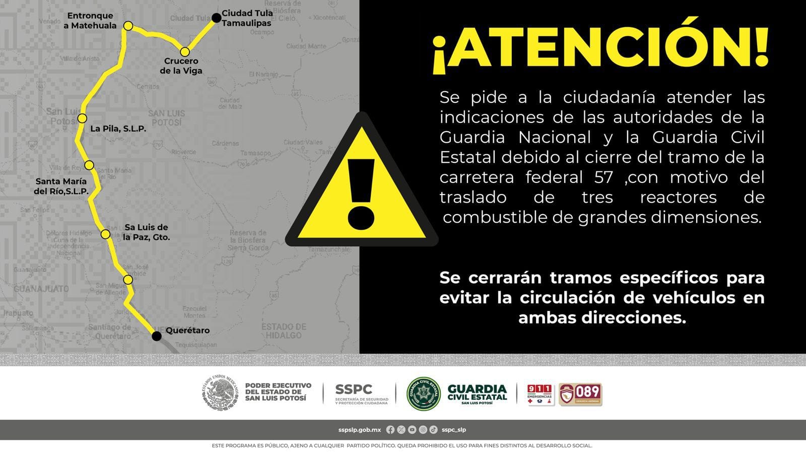 EFECTÚAN CIERRES VIALES EN CARRETERA POR TRASLADO DE REACTORES