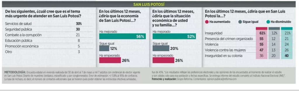 La encuesta reveló que el 56 por ciento de la ciudadanía considera que en los últimos 12 meses la economía de San Luis Potosí ha mejorado, mientras que el 52 por ciento, sintió que la situación económica personal y de las familias también mejoró, muestra de que los programas sociales impulsados por la administración, como becas alimentarias, escolares y programas de ayuda social, han tenido un impacto muy favorable en las familias potosinas.