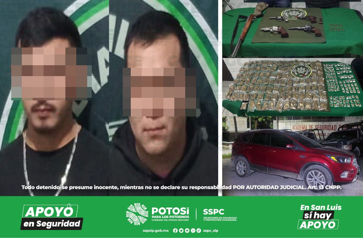 Ciudad del Maíz, S.L.P.- Un importante aseguramiento de enervantes se dio en las últimas 24 horas, luego de la captura de dos objetivos criminales generadores de violencia, sorprendidos con más de 200 dosis de droga en su poder y armamento diverso, además de una camioneta robada, resultado de los trabajos de la Base de Operaciones Mixta Interinstitucional (BOMI) de Guardia Civil Estatal, SEDENA y policía municipal.
