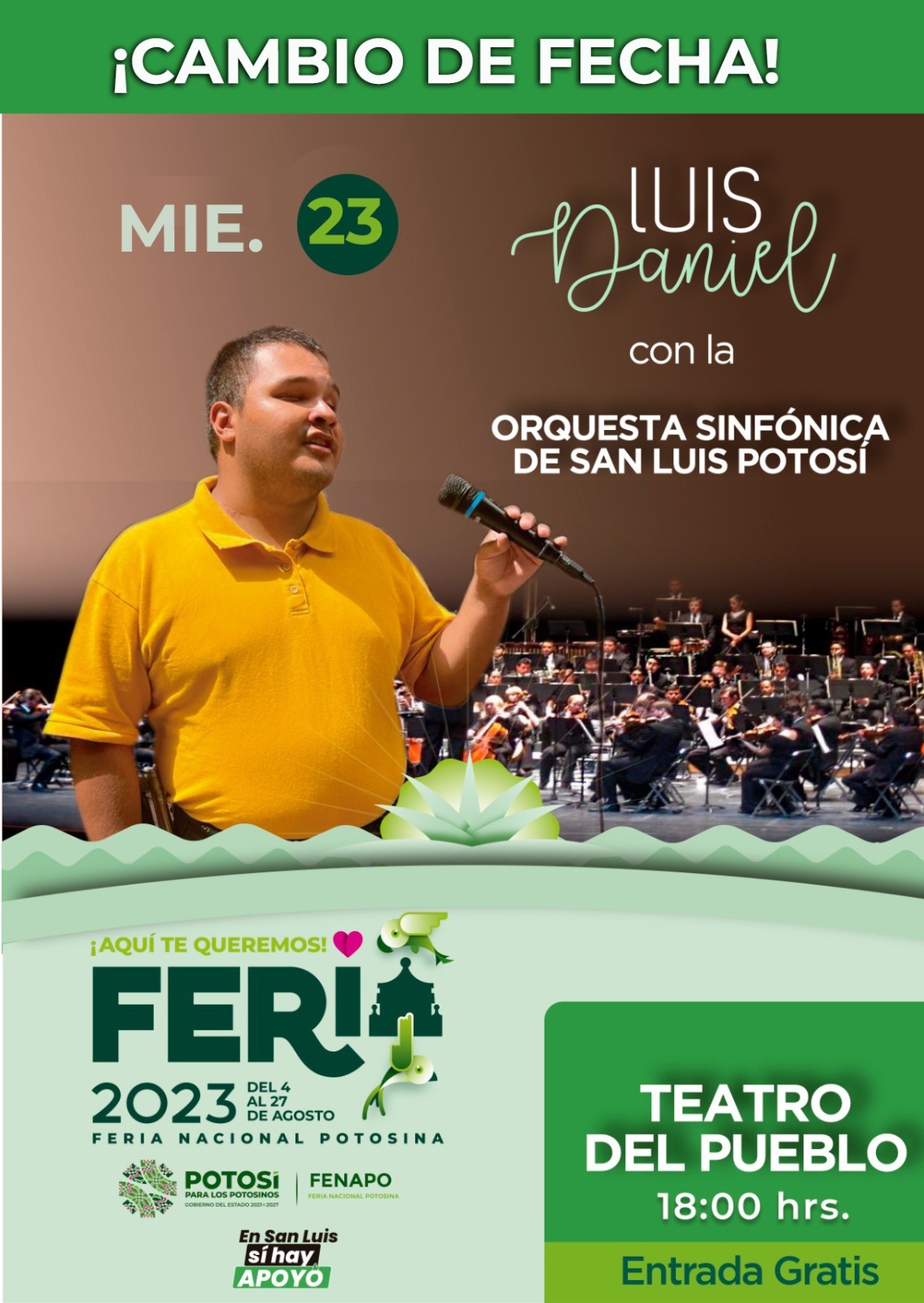 La presentación de Luis Daniel Velázquez “el Luis Miguel potosino” en el Teatro del Pueblo de la Feria Nacional Potosina (Fenapo), cambió de fecha y se llevará a cabo este miércoles 23 de agosto a las 18:00 horas, donde acompañado por la Orquesta Sinfónica de San Luis Potosí, deleitará a las y los asistentes con su gran voz, gracias al apoyo que brinda el Gobernador Gallardo Cardona, a cantantes y artistas potosinos.
