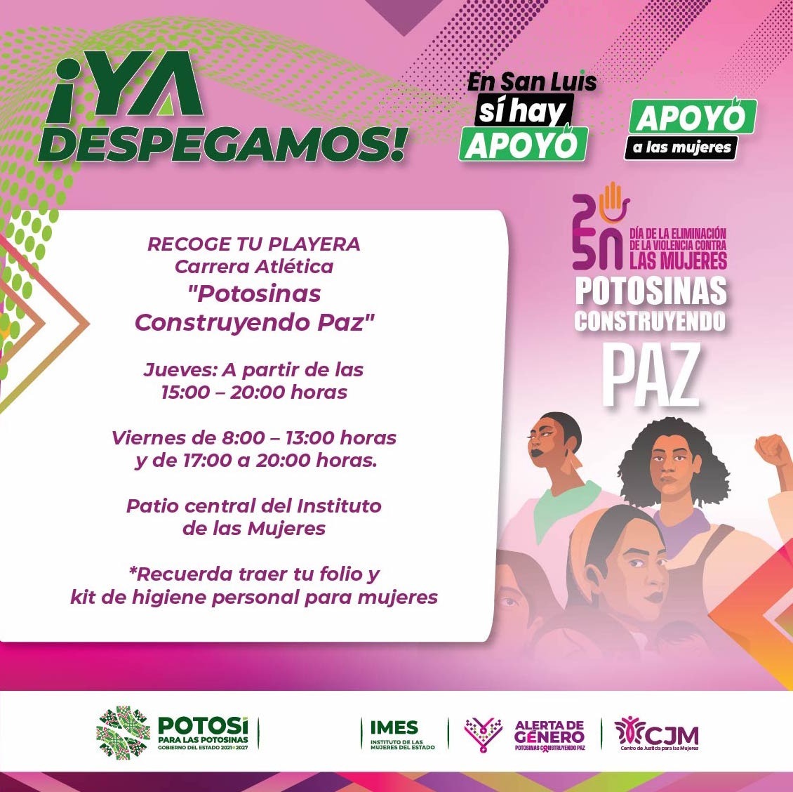 Las inscripciones aún se pueden realizar en el sitio https://imes-fua.com.mx/carrera_atletica/, las playeras se entregan este jueves en horario de 15:00 a 20:00 horas y viernes de 8:00 a 13:00 horas en las oficinas del Imes en Jardín Colón número 23, en el barrio de San Miguelito. Las diversas actividades pueden consultarse en la página de Facebook: Instituto de las Mujeres del Estado de San Luis Potosí.