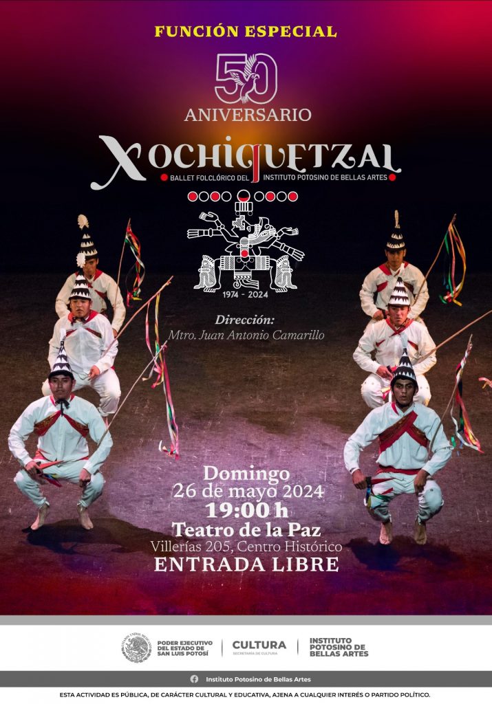 Como parte de la amplia oferta artística y de sano esparcimiento en San Luis Potosí, el Poder Ejecutivo del Estado, a través de la Secretaría de Cultura (Secult), celebrará el 50 Aniversario del Ballet Folclórico Xochiquetzal del Instituto Potosino de Bellas Artes (IPBA), este domingo 26 de mayo a las 19:00 horas en el Teatro de la Paz con entrada libre.