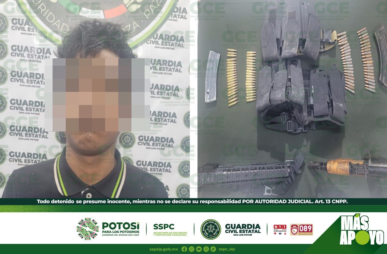 Guadalcázar, S.L.P.- Durante labores de seguridad y prevención implementadas en el operativo Altiplano Seguro, elementos de la Guardia Civil Estatal, detuvieron a dos personas dedicadas al robo en la carretera federal 57, asegurándoles dos fusiles de asalto, cartuchos, cargadores y equipo táctico.
