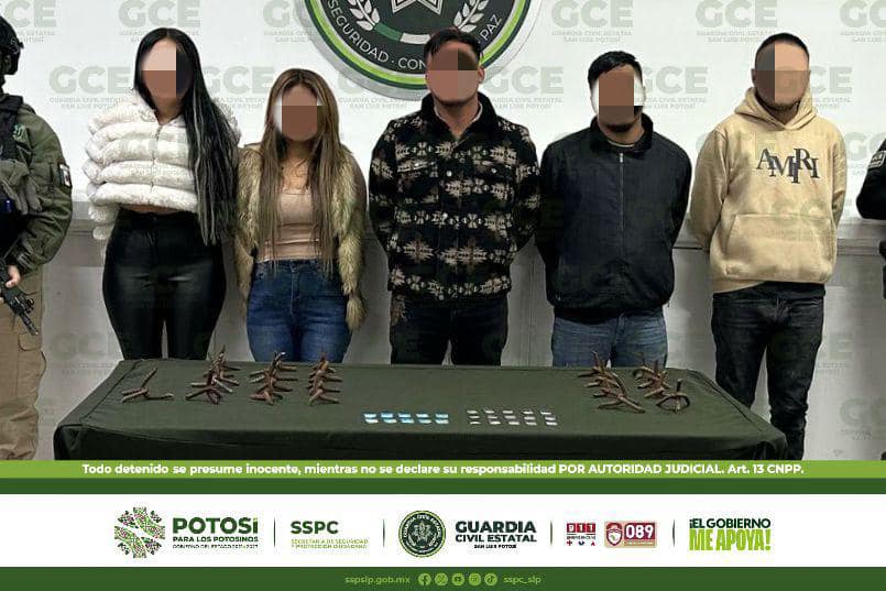 Tras una inspección, José “N” de 28 años de edad, Teresa “N” de 29 años, Rosa “N” de 36 años, así como Víctor “N” de 29 años, quien cuenta con un mandamiento judicial en la Procuraduría General en Nuevo León, por probables delitos contra la salud y Jonathan “N” de 28 años, con un mandamiento judicial vigente en la Procuraduría General en Puerto Vallarta, Jalisco, por secuestro, resultaron detenidos.
