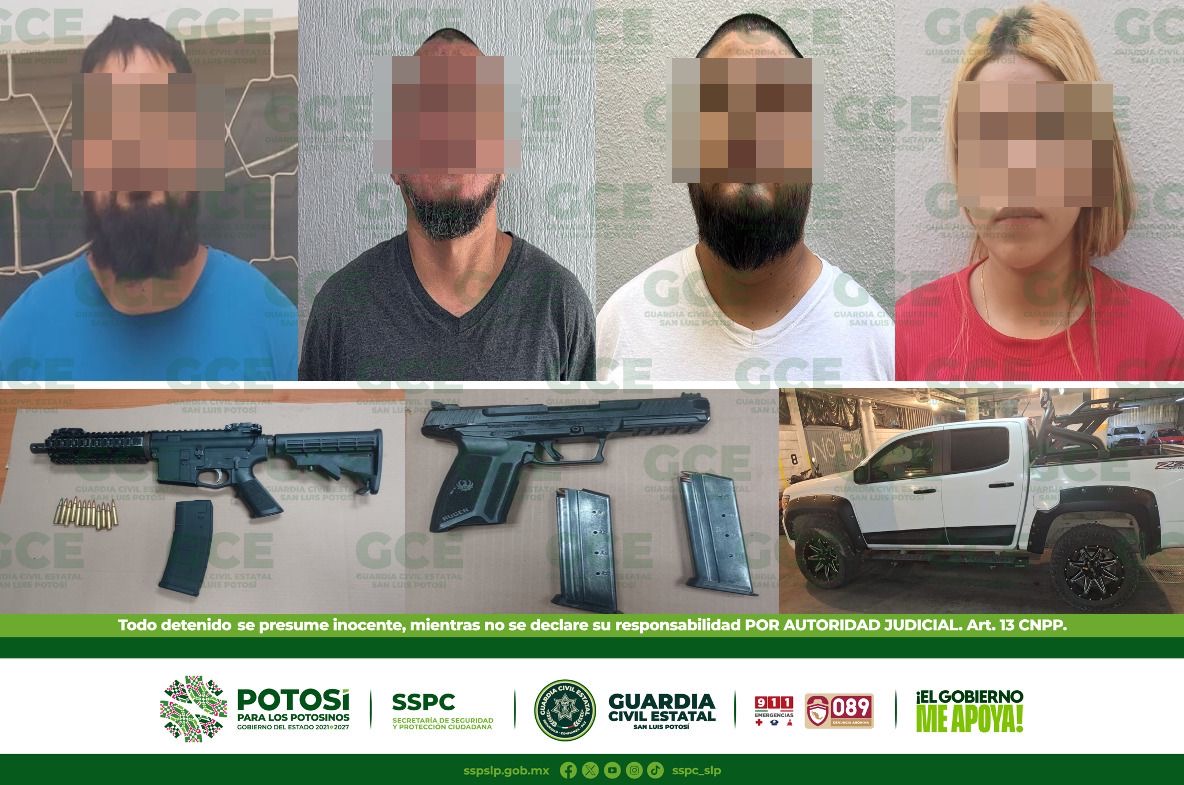 Villa de Pozos, S.L.P.- Cuatro presuntos integrantes de una célula criminal, fueron detenidos en el fraccionamiento Los Lagos por la Guardia Civil Estatal en coordinación con la Policía de Investigación de la FGE, asegurándoles dos armas de fuego y cartuchos.