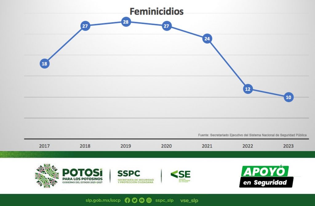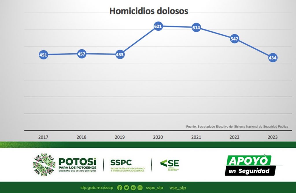 Con acciones y operativos altamente efectivos en apoyo a la tranquilidad y paz en territorio potosino, el Gobierno del Estado mantiene a San Luis Potosí por debajo de la media a nivel nacional en incidencia delictiva y durante 2023 delitos de alto impacto como homicidio doloso, feminicidio, secuestro, robo a casa habitación y robo de vehículos de cuatro ruedas, alcanzaron la cifra más baja de los últimos seis años.