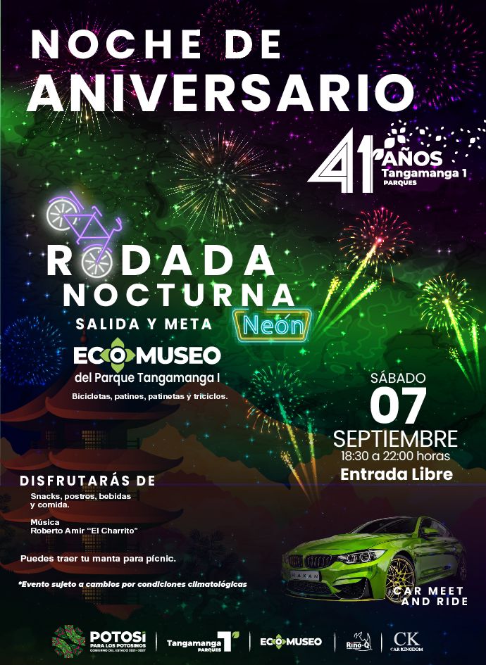Para conmemorar el 41 aniversario del parque Tangamanga I, los Centros Estatales de Cultura y Recreación Tangamanga (Cecurt), este sábado 7 de septiembre realizarán una Rodada Nocturna Neón y posteriormente una convivencia de picnic con la participación de Roberto Amir “El Charrito”, a partir de las 19:00 horas.