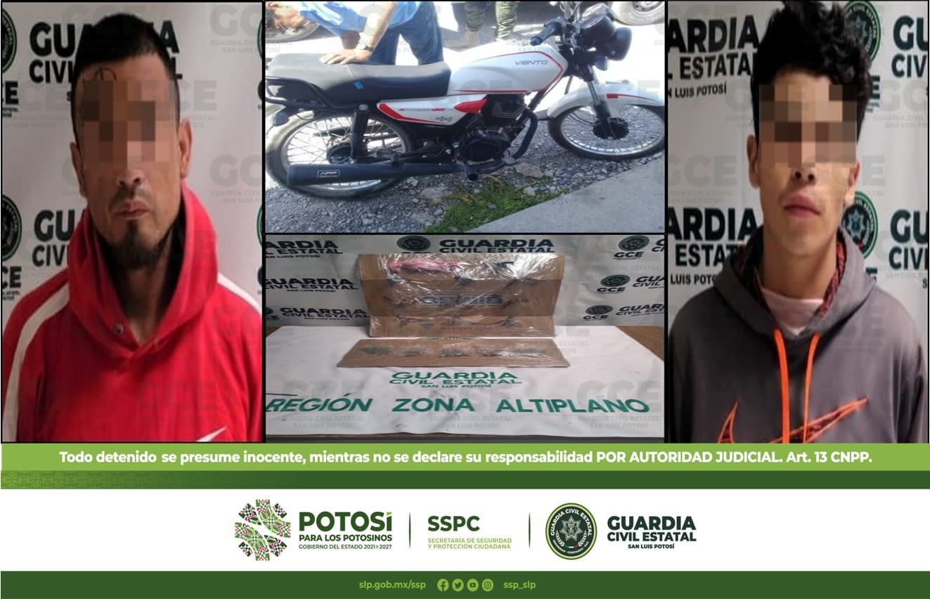 Los agentes estatales realizaban recorridos de seguridad y prevención en la zona centro de Matehuala cuando al llegar a la avenida de Las Torres y Fray Bartolomé, ubicaron a los presuntos a bordo de una motocicleta, los cuales, al ver la presencia de las fuerzas del orden, imprimieron mayor velocidad para evadir a las autoridades.