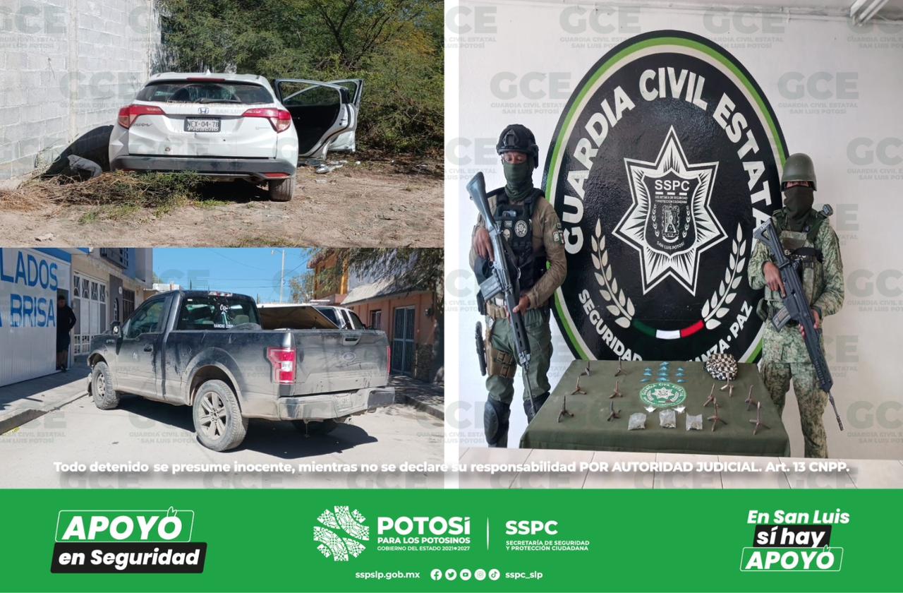 Matehuala, S.L.P.- Acciones desplegadas en el dispositivo “Altiplano Seguro”, mediante la Base de Operaciones Mixta Interinstitucional (BOMI), agentes de Guardia Civil Estatal (GCE) y SEDENA, aseguraron dos camionetas que presumiblemente son usadas por la delincuencia; los vehículos fueron abandonados tras una persecución.