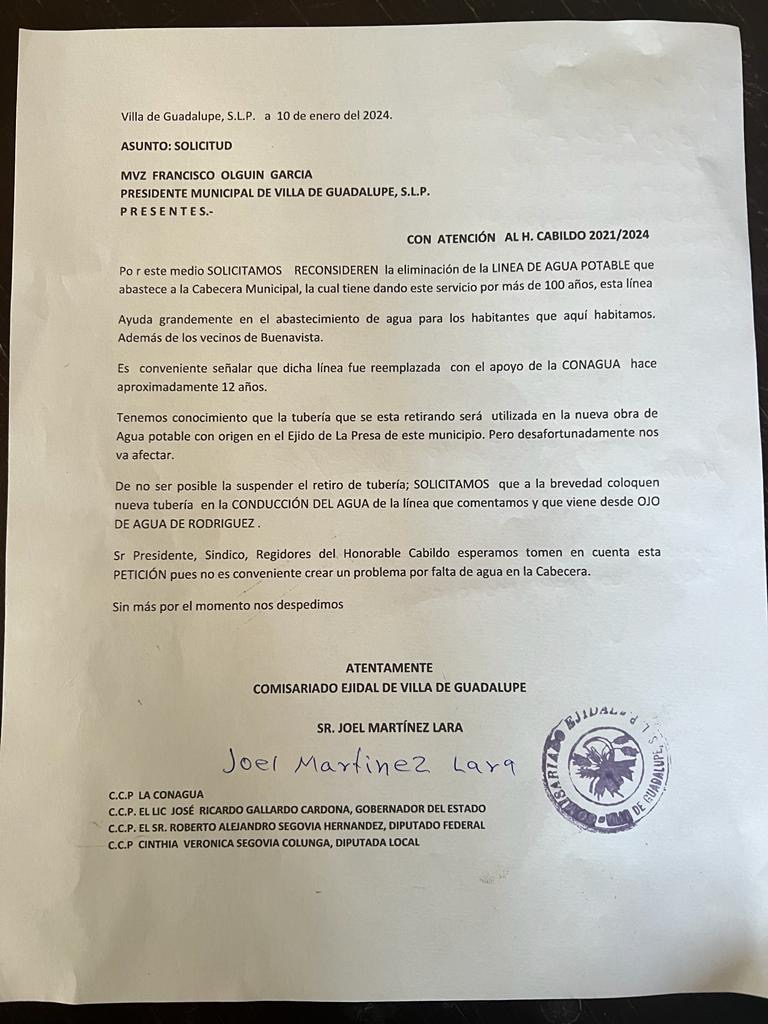 Pobladores del municipio de Villa de  Guadalupe alzaron la voz para solicitar al Presidente Municipal Francisco OlguínGarcía reconsidere la eliminación de la línea de agua potable  que abastece a la cabecera municipal, misma que ha brindado el servicio por más de 100 años.