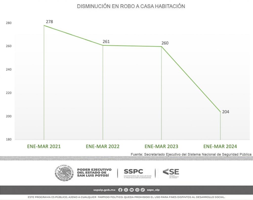 San Luis Potosí se mantiene por debajo de la media nacional en algunos de los delitos más graves, como resultado de la estrategia Integral de Seguridad Pública implementada por el Poder Ejecutivo del Estado, de acuerdo con el último informe del Secretariado Ejecutivo del Sistema Nacional de Seguridad Pública (SESNSP).