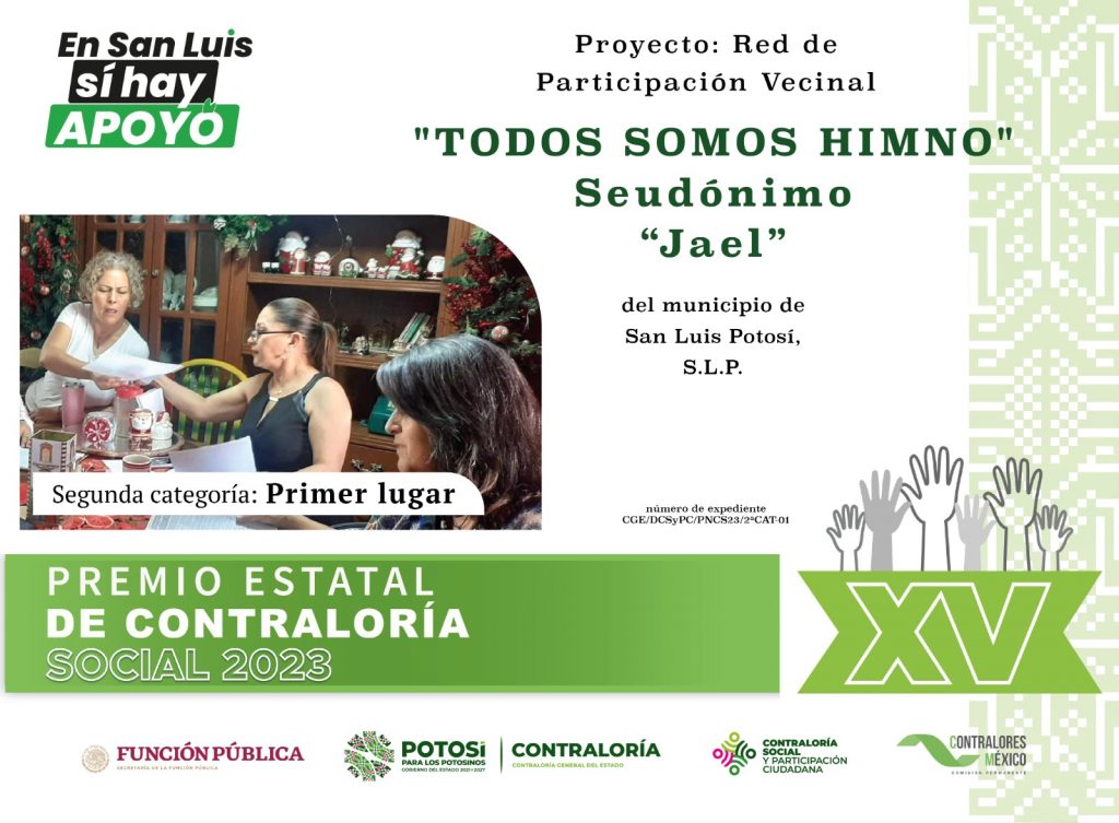 El contralor informó que, el comité ganador de la categoría “Acciones de vigilancia ciudadana en la gestión pública” fue la Red de participación Vecinal «Todos Somos Himno», Seudónimo “Jael” de la capital.