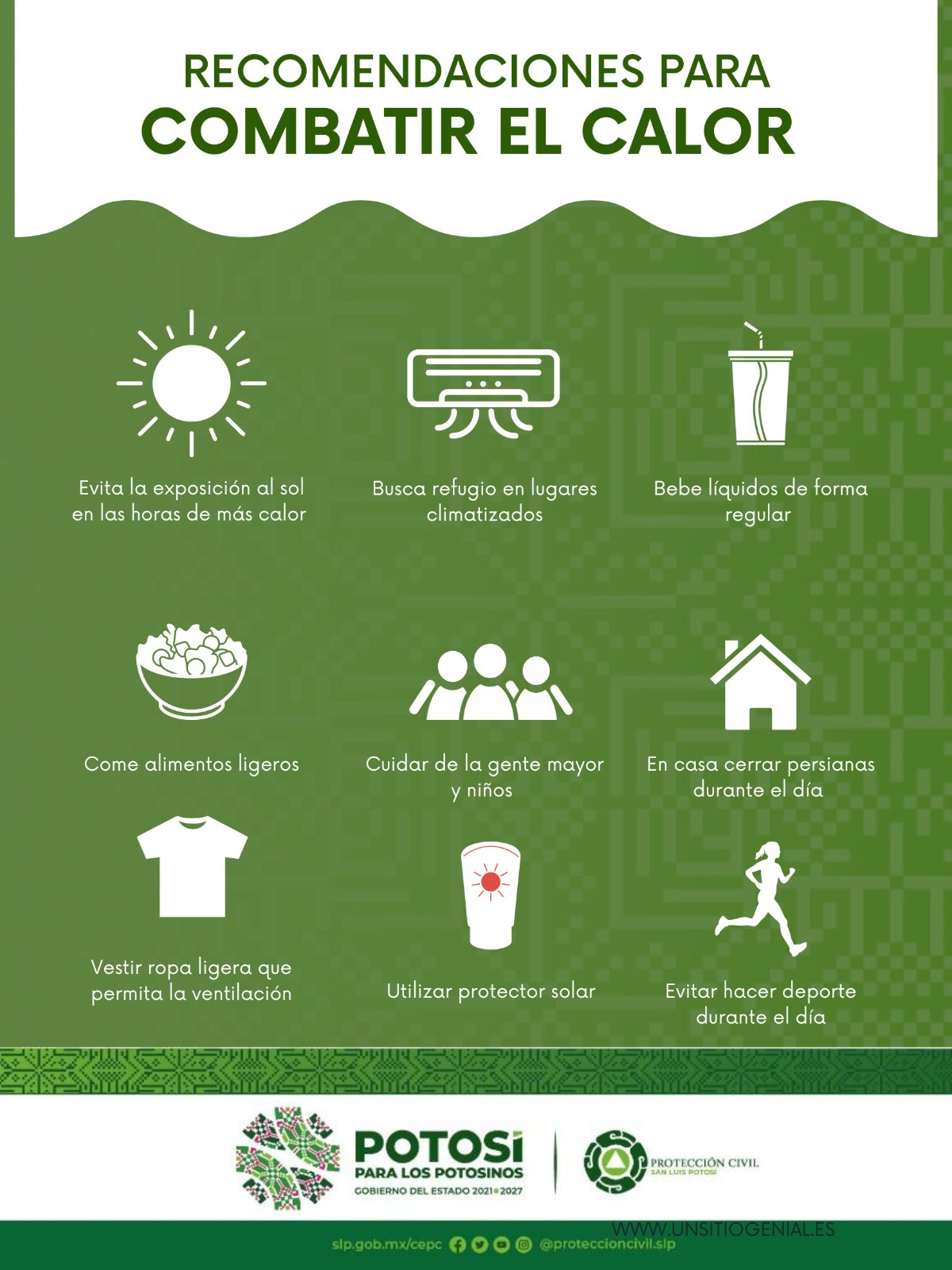 Solicitó a la ciudadanía mantenerse hidratada; evitar bebidas diuréticas como el café o té; no exponerse al sol y utilizar bloqueador, ropa fresca y proteger los ojos; buscar lugares frescos; no dejar a personas o mascotas en automóviles bajo el sol; mantener limpieza de manos; evitar consumir alimentos en la calle y preferir alimentos, cocidos, frescos y desinfectados.