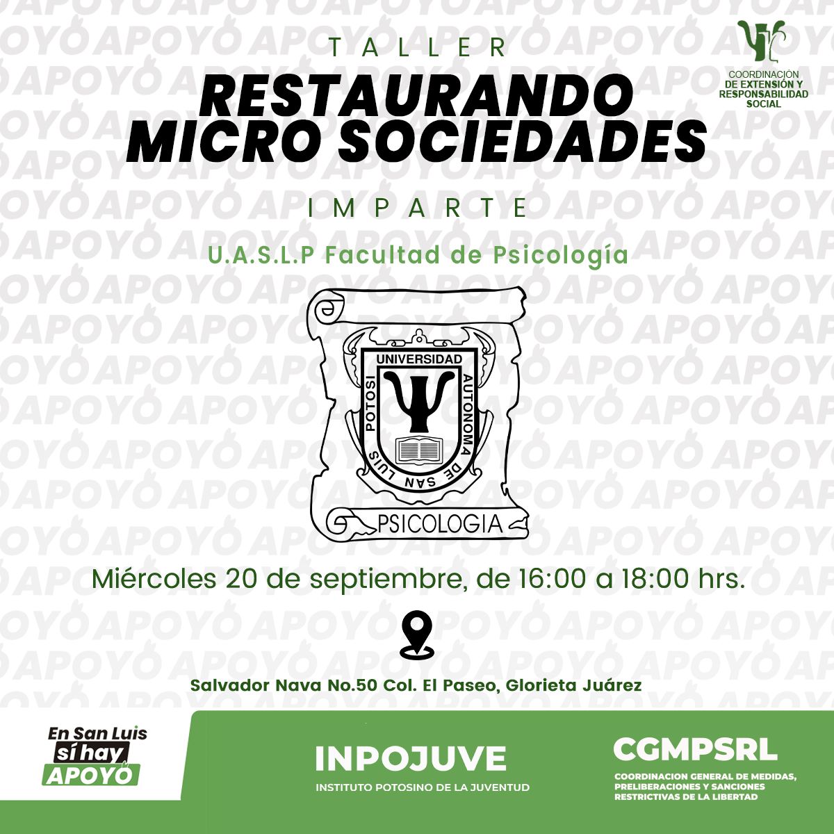 En apoyo a la juventud para empoderarla y prepararla a desempeñar un papel activo y positivo en la sociedad y promover la equidad y la inclusión, el Instituto Potosino de la Juventud (Inpojuve) en coordinación con la Facultad de Psicología de la Universidad Autónoma de San Luis Potosí (UASLP), llevará a cabo el taller «Restaurando Micro Sociedades», que iniciará este 20 de septiembre y se realizará cada miércoles de 16:00 a 18:00 horas durante 15 sesiones.