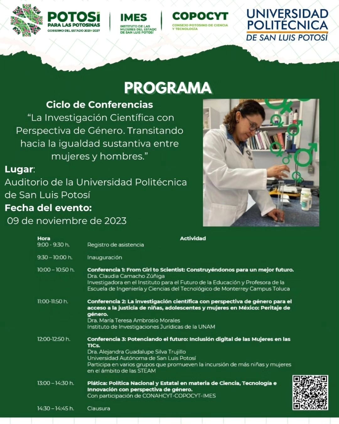 La titular de la dependencia estatal, Gloria María Guadalupe Serrato Sánchez, dijo que, en seguimiento a la política del Gobernador Ricardo Gallardo Cardona, de garantizar espacios de cero tolerancia a la violencia contra las mujeres, la actividad incluirá cuatro interesantes conferencias sobre la investigación científica y su labor a favor de la igualdad.