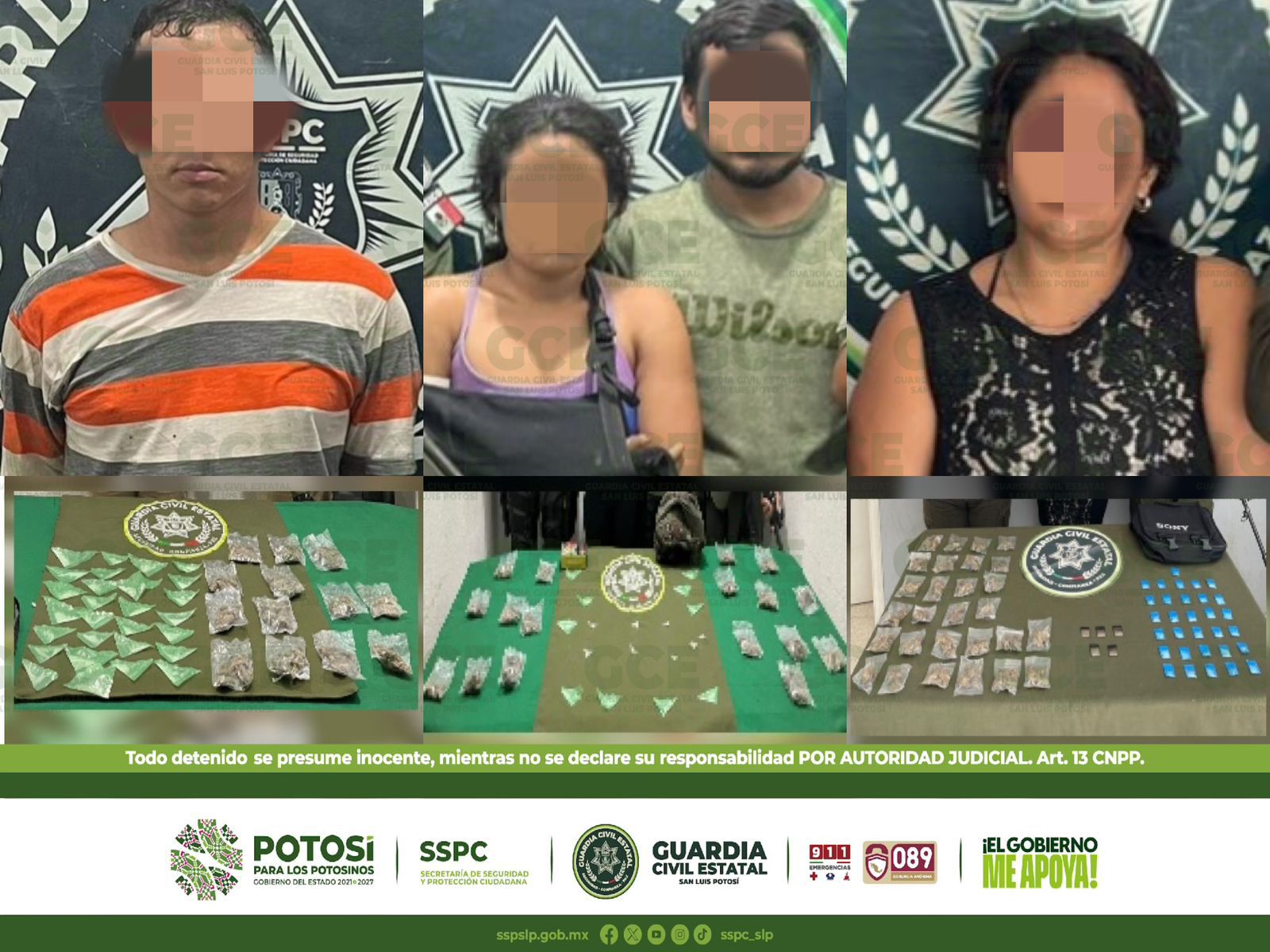 S.L.P.- Contundentes acciones de la Guardia Civil Estatal en el combate al narcomenudeo, dieron con resultado la detención en distintas acciones de cuatro presuntos narcomenudistas en el estado a los que se les aseguraron 140 dosis de enervantes.