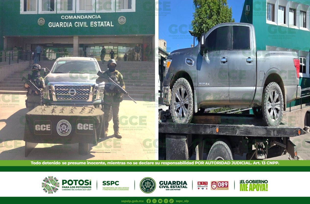 Elementos de la G.C.E, encontrándose dentro del operativo Norte Seguro, implementado en la zona metropolitana, con el objetivo de inhibir hechos constitutivos de delito, durante recorridos de seguridad y vigilancia, ubicaron una camioneta en un camino de terracería en la colonia Orilla del Río, en el municipio de Mexquitic de Carmona.