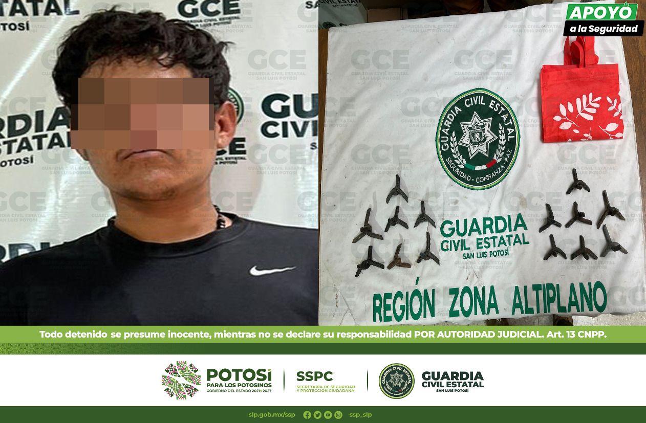 Matehuala, S.L.P.- En diferentes operativos de seguridad emitidos por agentes de la Guardia Civil Estatal (GCE) un hombre fue arrestado tras asegurarle 14 objetos de varilla corrugada, conocidos como “poncha llantas”.