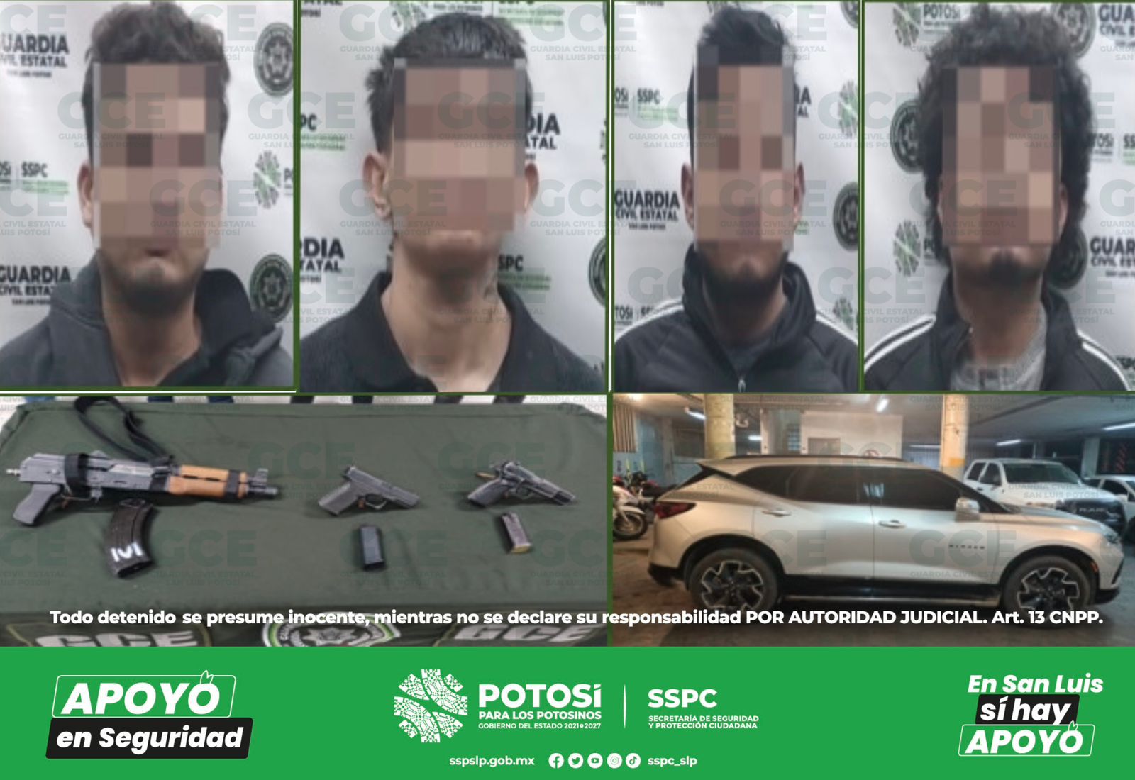 Además de la camioneta en la que se desplazaban, marca Chevrolet, tipo Blazer, color gris, modelo 2019, la cual fue robada con violencia en el 2022 del municipio de Villa de Arriaga. Por lo anterior, los detenidos fueron puestos a disposición de la Fiscalía General de la República junto con el armamento y vehículo asegurado.