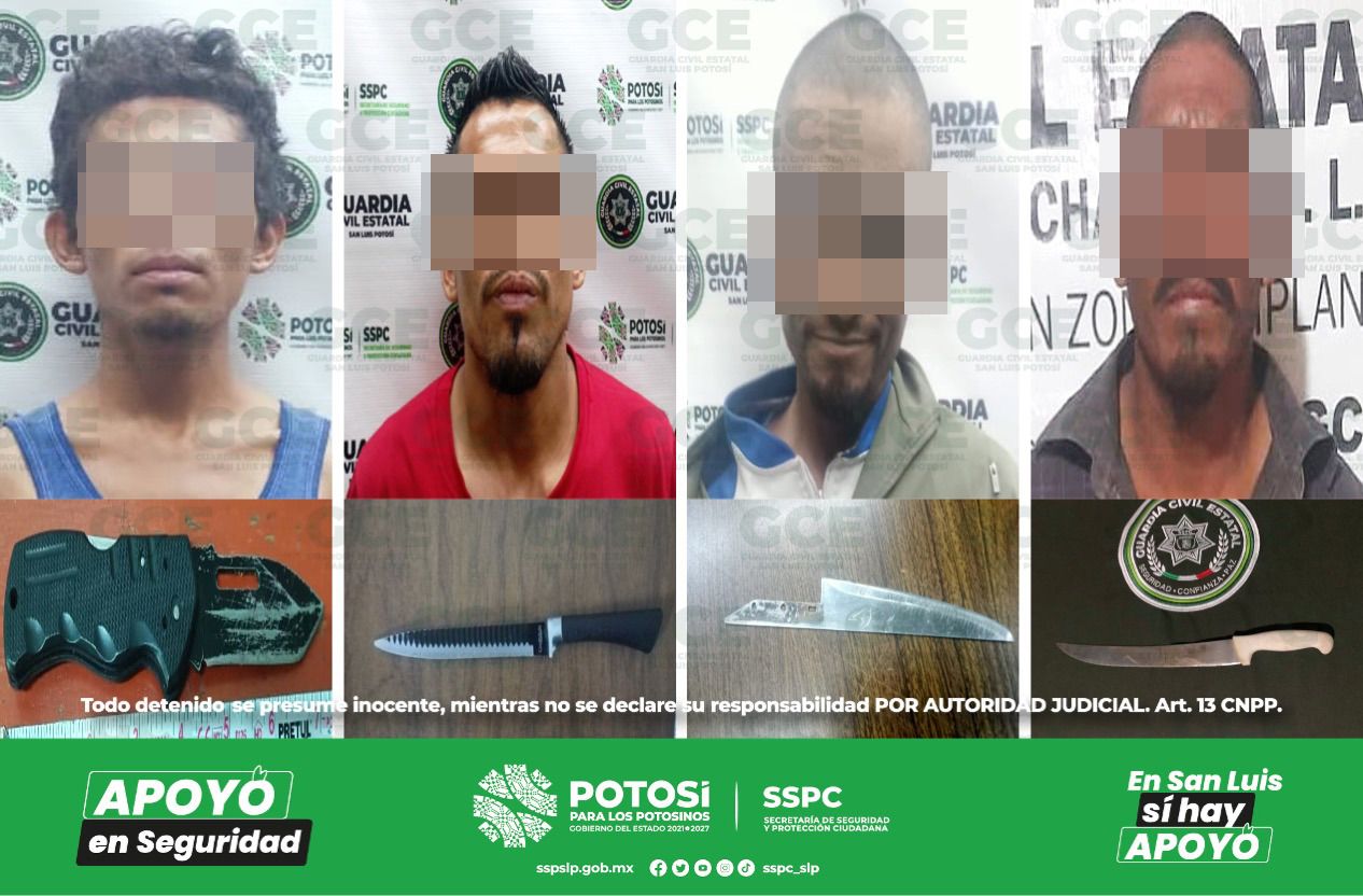 S.L.P.- Gracias a los dispositivos de prevención y disuasión, oficiales de la Guardia Civil Estatal (GCE) detuvieron a cuatro individuos en diferentes puntos de la entidad potosina, tras asegurarles armas punzocortantes.