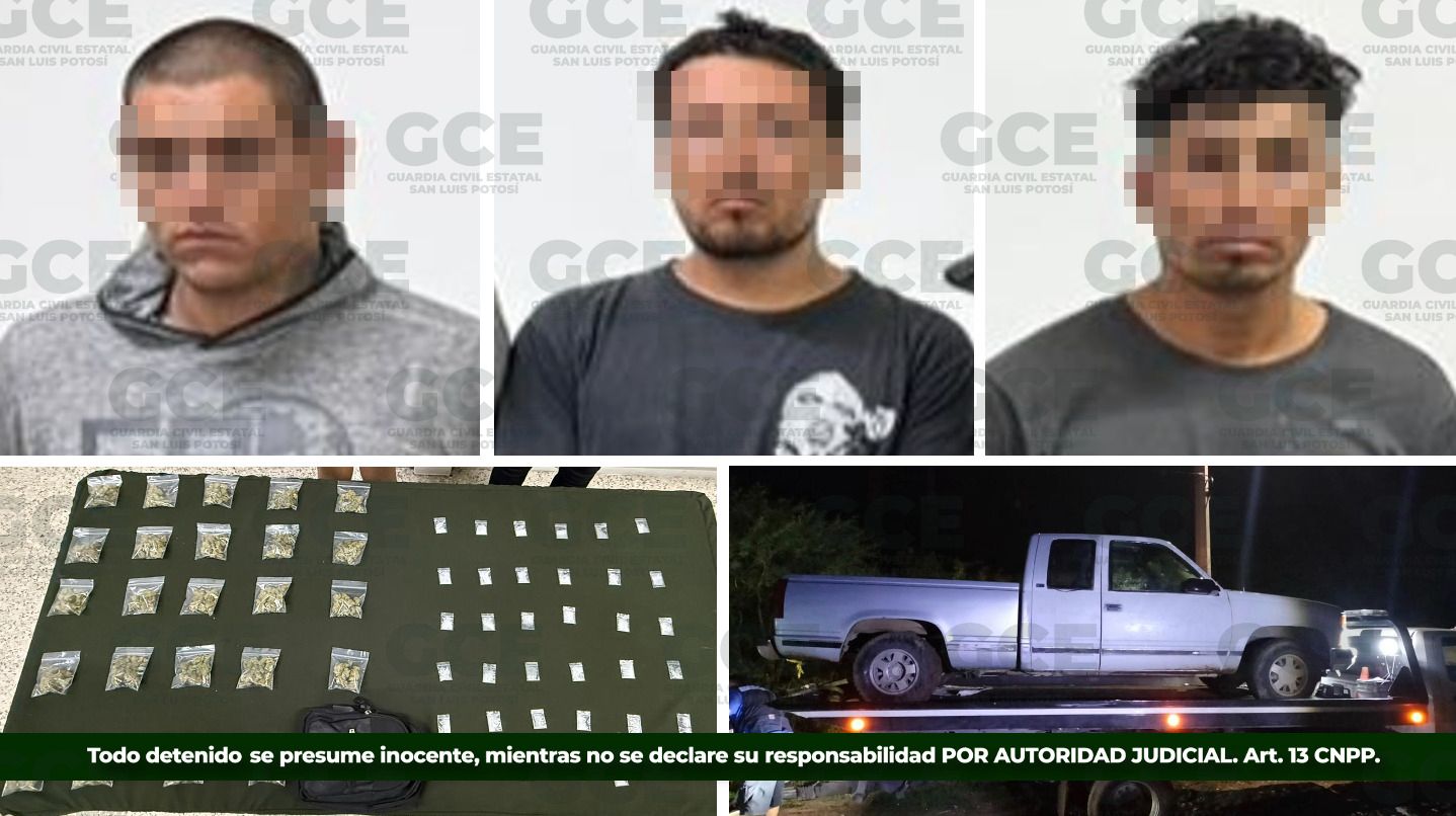 Guadalcázar, S.L.P.- Como parte de la aplicación del Plan Integral de Seguridad que se aplica en toda la entidad, agentes de la Guardia Civil Estatal detuvieron a cuatro personas con varias dosis de estupefacientes mientras desvalijaban una camioneta.