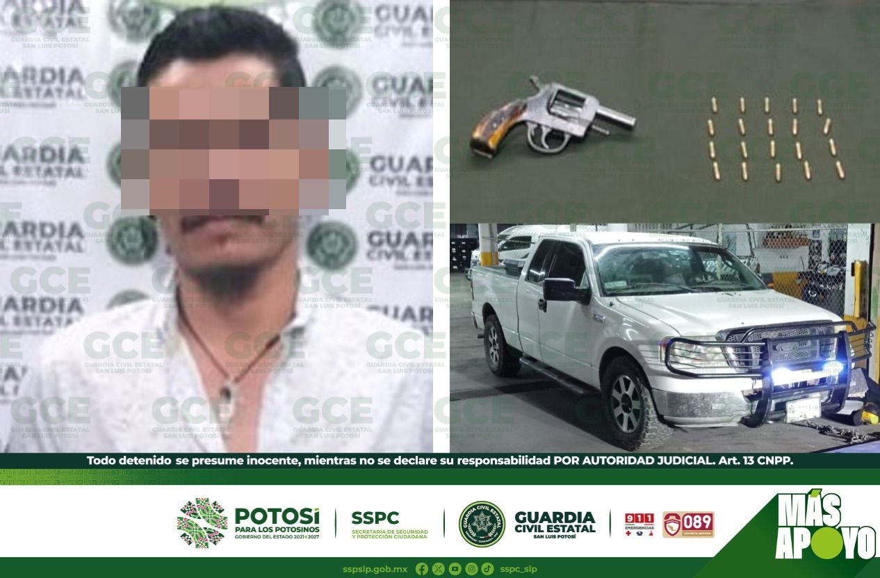Armadillo de los Infante, S.L.P.- Operativos de seguridad efectuados por la Guardia Civil Estatal para el combate a delitos de alto impacto, derivó en el arresto de un hombre, por la probable portación de un arma de fuego.
