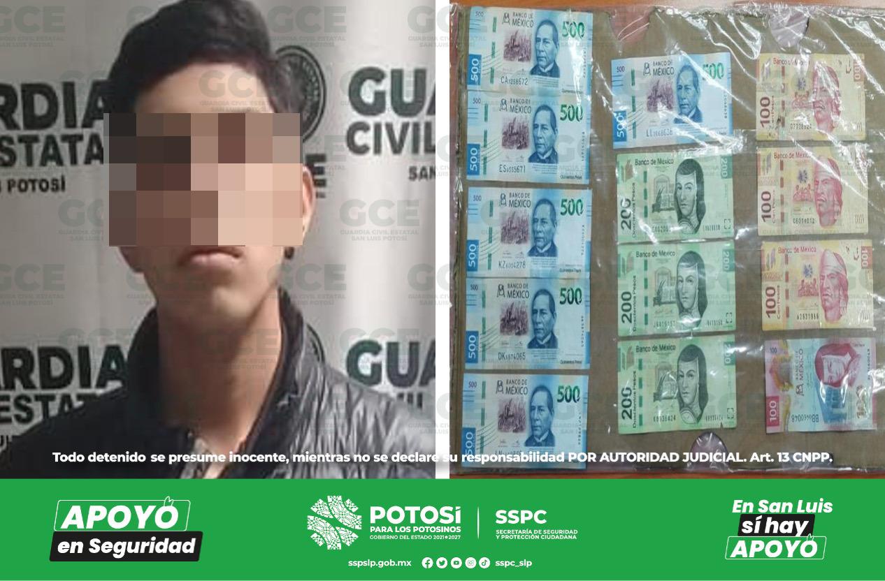 Matehuala, S.L.P.- Gracias a una denuncia ciudadana atendida en la Línea de Emergencias 911, policías de la Guardia Civil Estatal (GCE) detuvieron a un joven por el probable delito de fraude; se le aseguraron 4 mil pesos en efectivo.