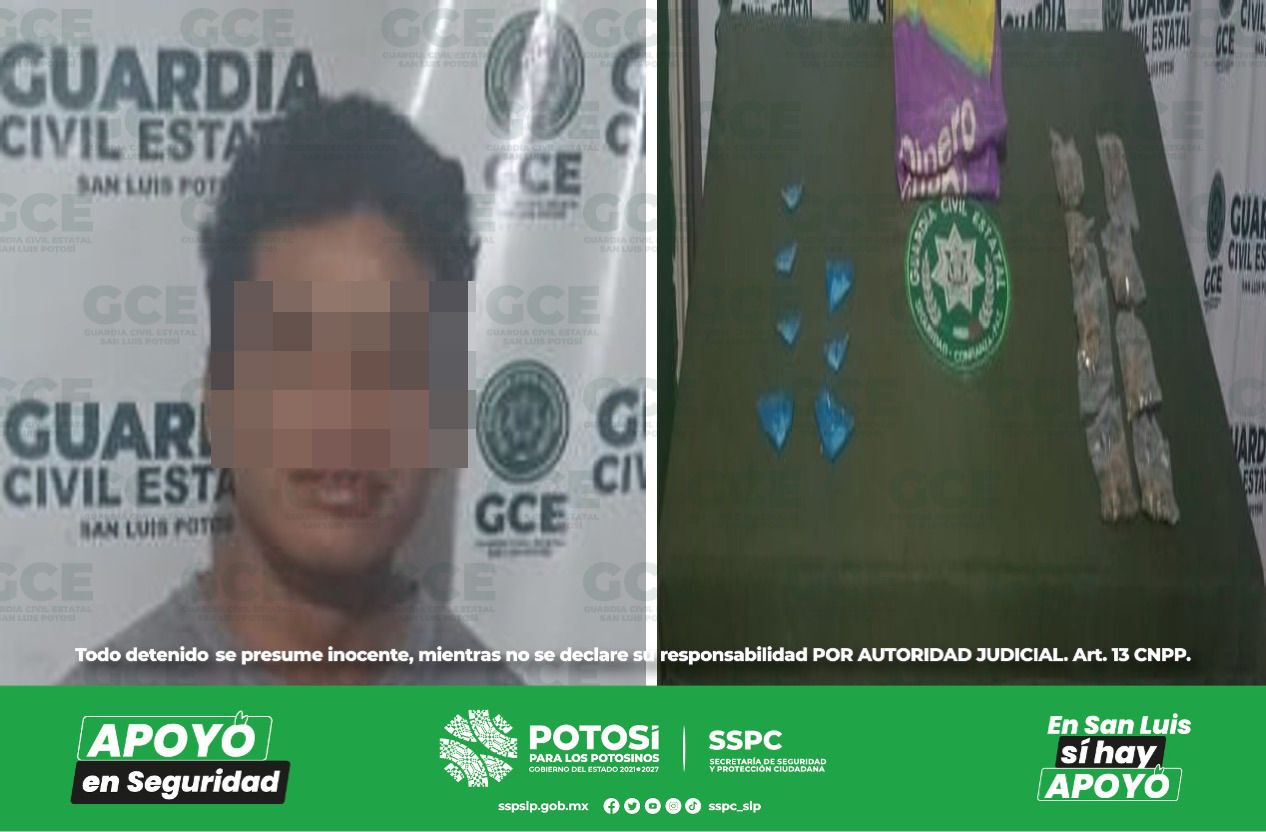 Matehuala, S.L.P.- Policías de la Guardia Civil Estatal (GCE) efectuaron la detención de un individuo quien presumiblemente es parte de un grupo delictivo, dedicada al narcomenudeo; al momento de su detención se le aseguraron dosis de marihuana y “cristal” en su poder, preparadas para su venta individual.