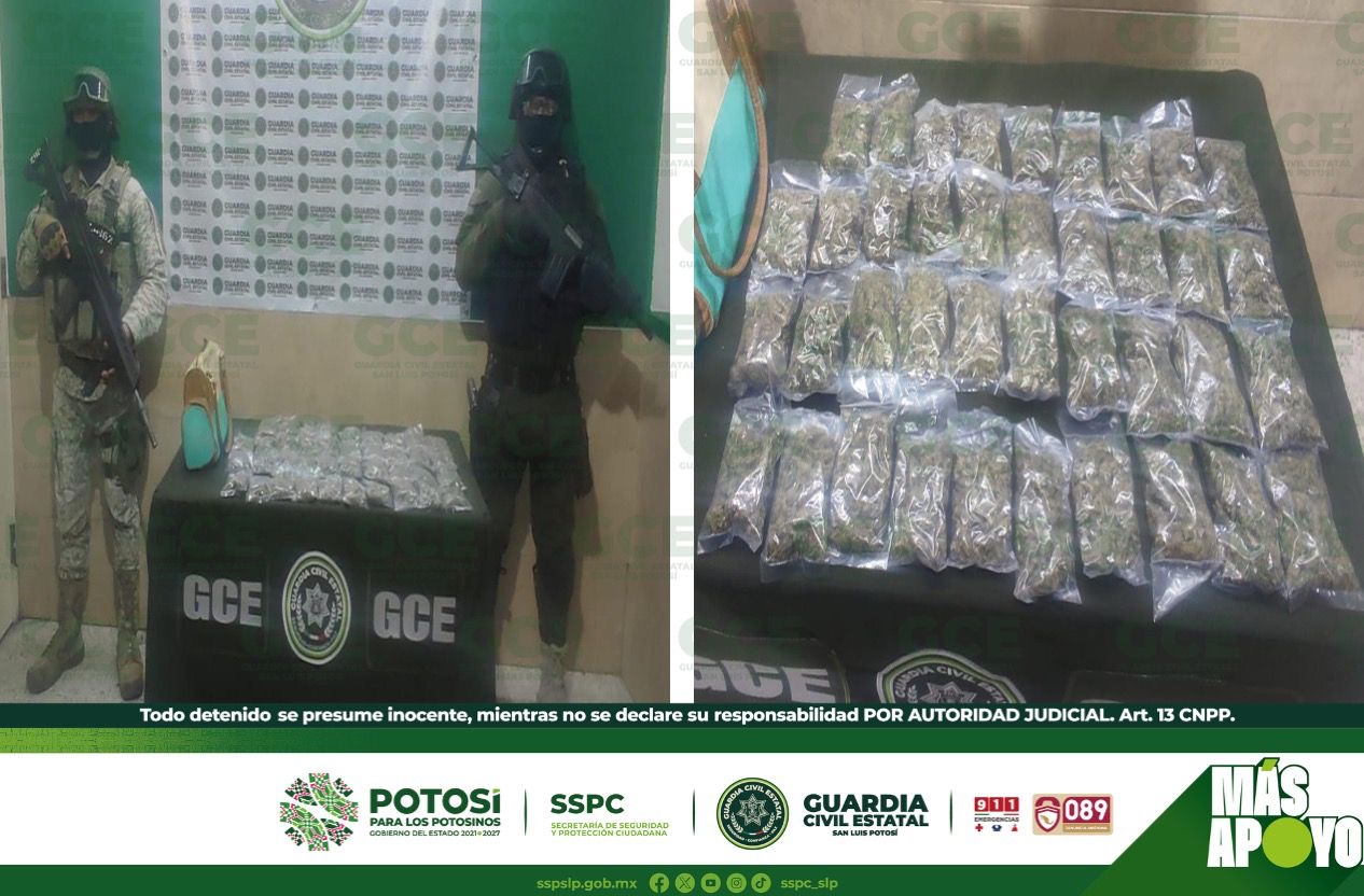 Salinas de Hidalgo, S.L.P.- Operativos de seguridad, efectuados por agentes de la Guardia Civil Estatal en coordinación con el Ejército mexicano, derivaron en el aseguramiento de más de un kilo de marihuana, distribuido en dosis individuales.