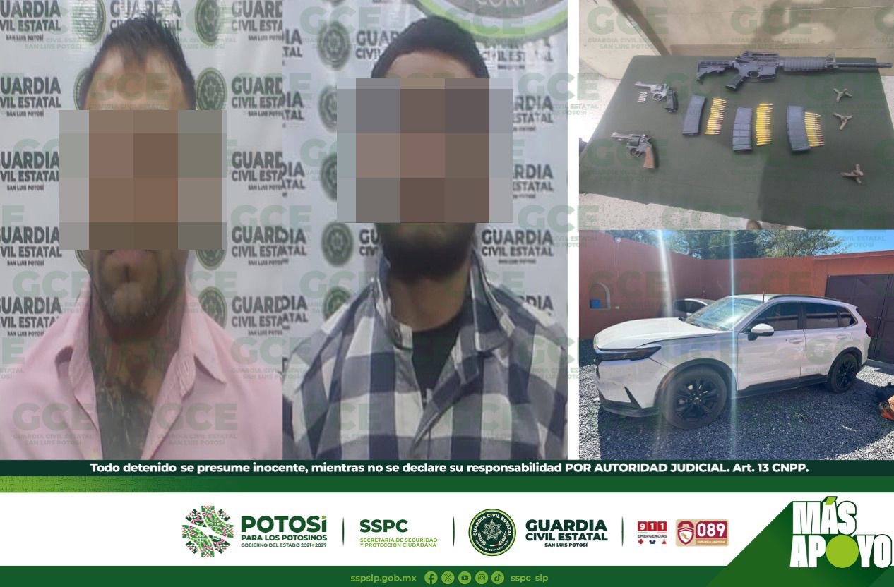 Los hechos tuvieron lugar en la carretera 63 en el tramo Moctezuma-Venado, en donde los elementos de la GCE y SEDENA, detuvieron a Jonathan “N” de 18 años de edad y José “N” de 38 años, a quienes les aseguraron un arma larga calibre 5.56, así como dos armas de fuego tipo revólver calibre 357 así como una calibre 38 especial, además de cuatro cargadores y 53 cartuchos útiles, dos chalecos tácticos y tres artefactos conocidos como “poncha llantas”, así como una camioneta tipo panel, marca Honda, con placas del Estado de Texas.