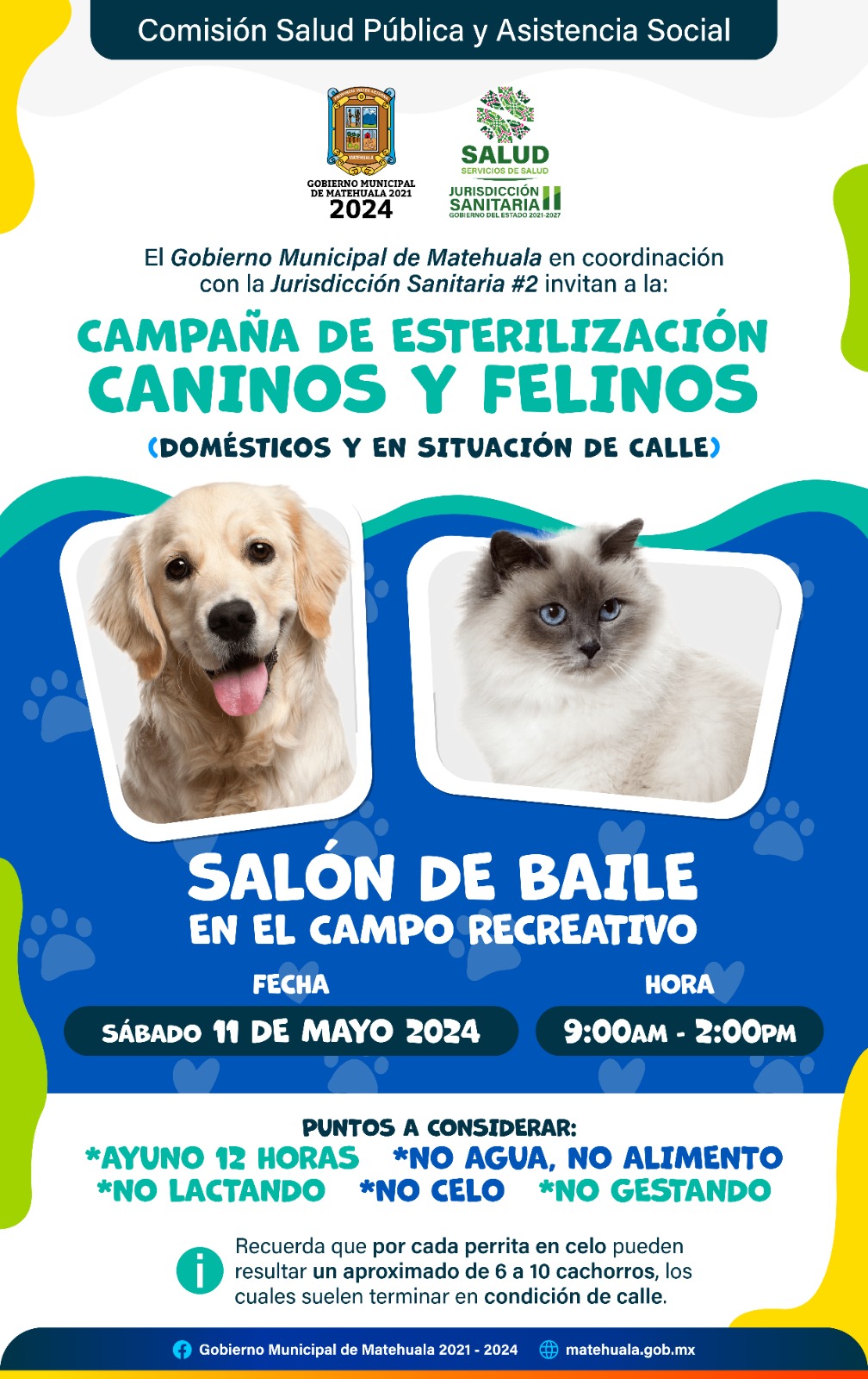 El gobierno municipal de Matehuala en coordinación con la jurisdicción sanitaria número dos, invitan a la ciudadanía en general a participar en la campaña de esterilización canina y felina a celebrarse este próximo sábado 11 de mayo en el salón de baile del centro recreativo municipal.
