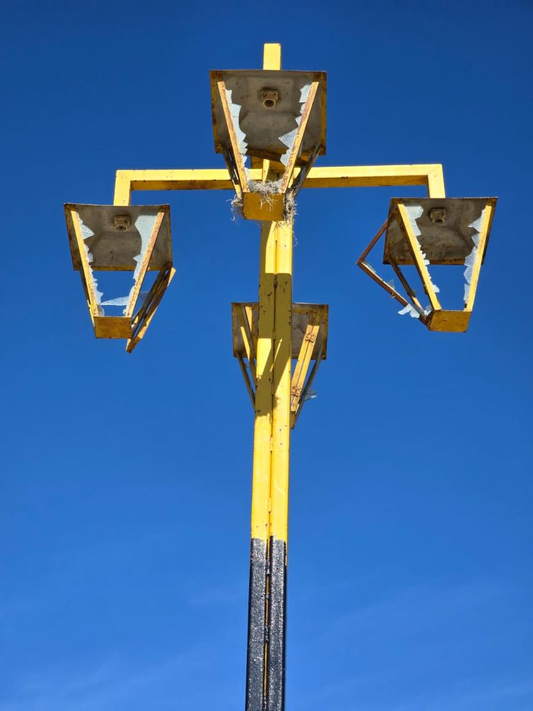 Un recorrido por la plaza revela un panorama desolador con postes de luz a medio pintar, lámparas sin vidrios y sin focos que tienen a la zona en una eterna penumbra, pero lo más indignante es encontrar, frente a una vivienda particular, propaganda política de pasadas campañas electorales.