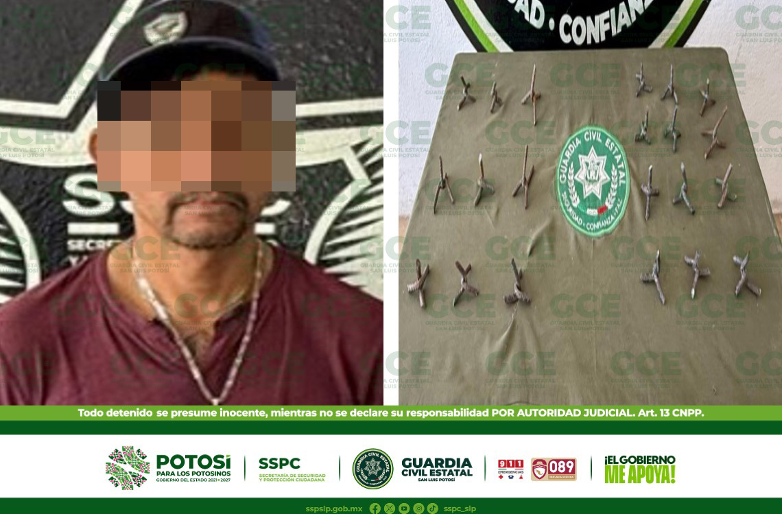 Matehuala, S.L.P.- Acciones contundentes para el combate a la delincuencia, permitieron la captura de un presunto integrante de una célula delictiva, después de que la Guardia Civil Estatal (GCE) le asegurara objetos conocidos como “poncha llantas”.