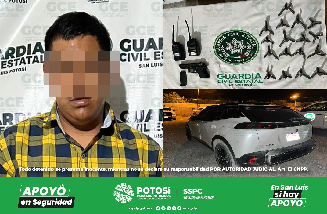 Matehuala, S.L.P.- Derivado de las tareas de prevención y disuasión emitidas en el operativo “Altiplano Seguro”, elementos de la Guardia Civil Estatal (GCE) detuvieron a un presunto criminal con un arma de fuego y varios objetos “poncha llantas” en su poder.