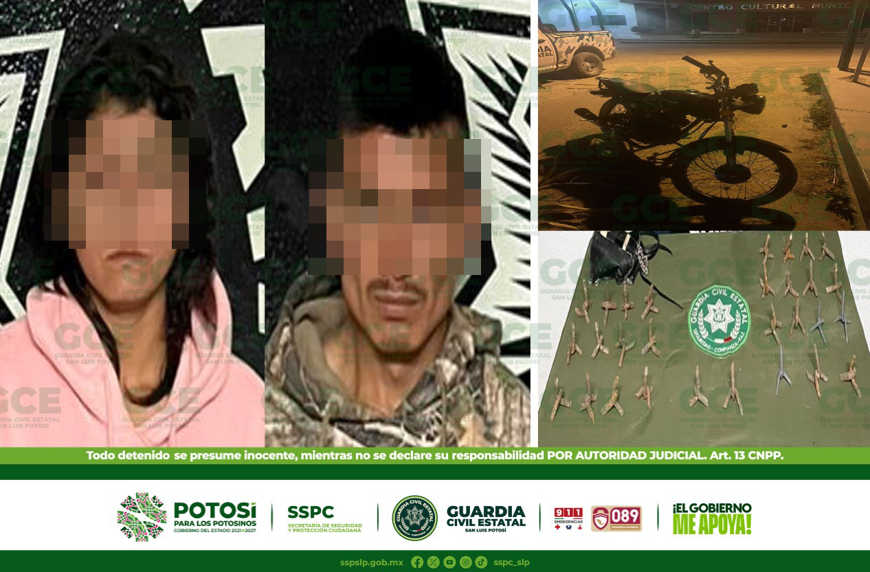Matehuala, S.L.P.- Acciones de seguridad y vigilancia, efectuadas por la Guardia Civil Estatal (GCE), permitieron la detención de un hombre y una mujer, por presuntos delitos contra la seguridad vial y posesión de artefactos prohibidos, conocidos como “poncha llantas”.