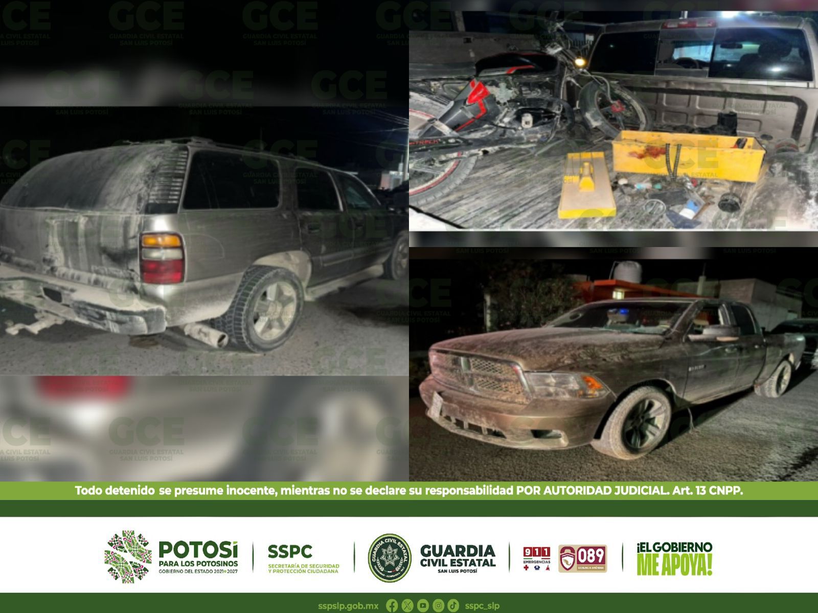 Los vehículos, una camioneta color arena, modelo 2010, la cual cuenta aparentemente con manchas hemáticas en la caja batea; una camioneta SUV color arena modelo 2002 y una motocicleta Treep Trape modelo 2024, fueron asegurados y resultaron sin novedad negativa.