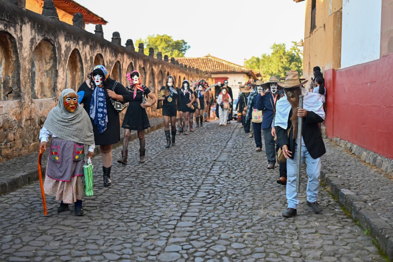 Desde el Centro Cultural Antiguo Colegio Jesuita hasta la presidencia municipal de Pátzcuaro, un vibrante desfile tomó vida con la participación de comparsas tradicionales provenientes de distintos municipios potosinos. Danzas, máscaras, atuendos típicos y música de viento transformaron el espacio público en una expresión viva del respeto a los que ya no están, pero también en una celebración de la vida misma.