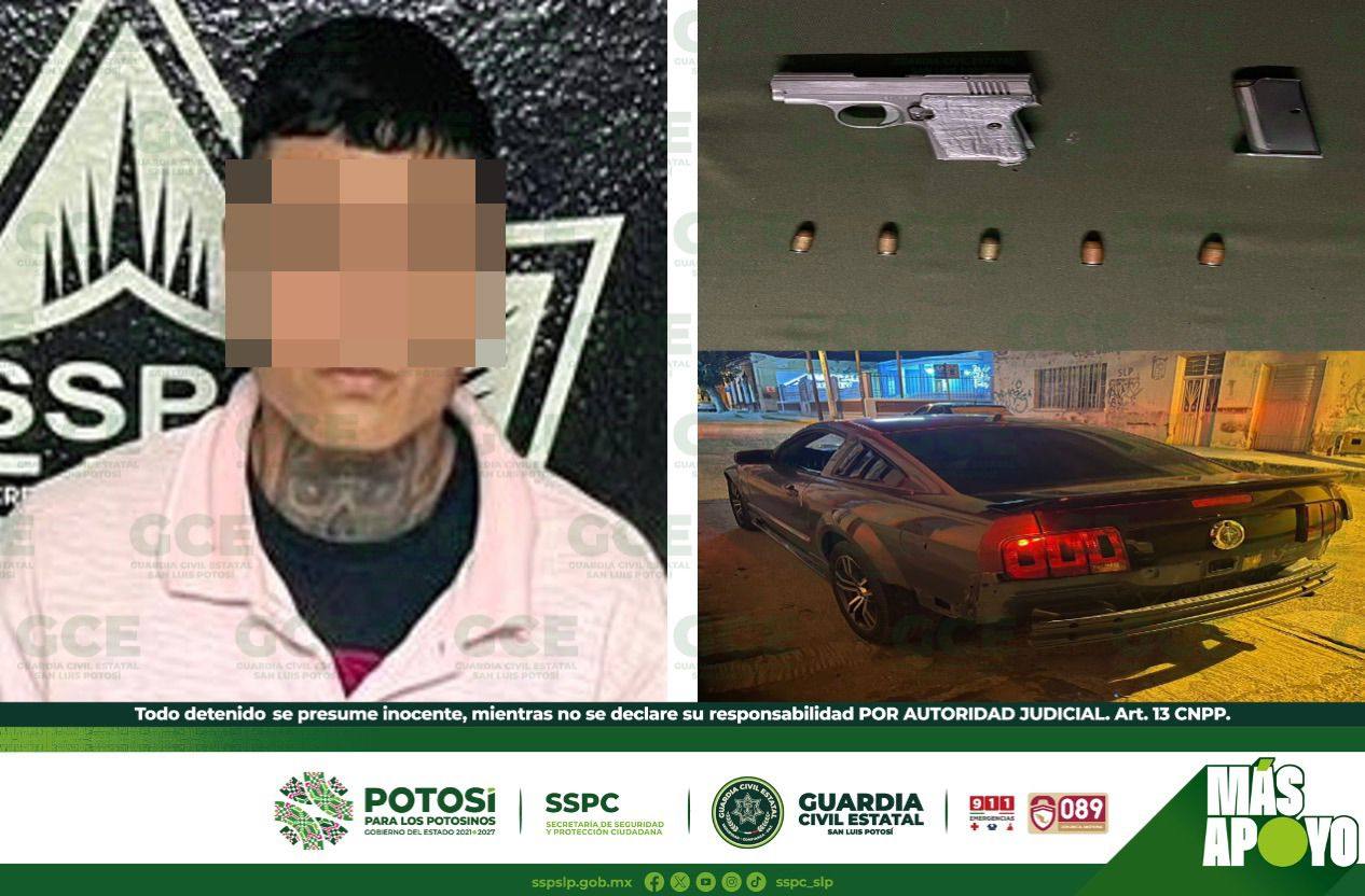 Los agentes estatales detectaron a un sujeto a bordo de un vehículo marca Ford, línea Mustang, quien trató de evadir la presencia policiaca, por ello le indicaron mediante señales audibles y visibles que debía detenerse. Fue en la calle de Melchor Ocampo, en donde se efectuó la detención de José “N” de 19 años de edad, luego de despojarle de un arma de fuego calibre .380 así como de un cargador y cinco cartuchos útiles.