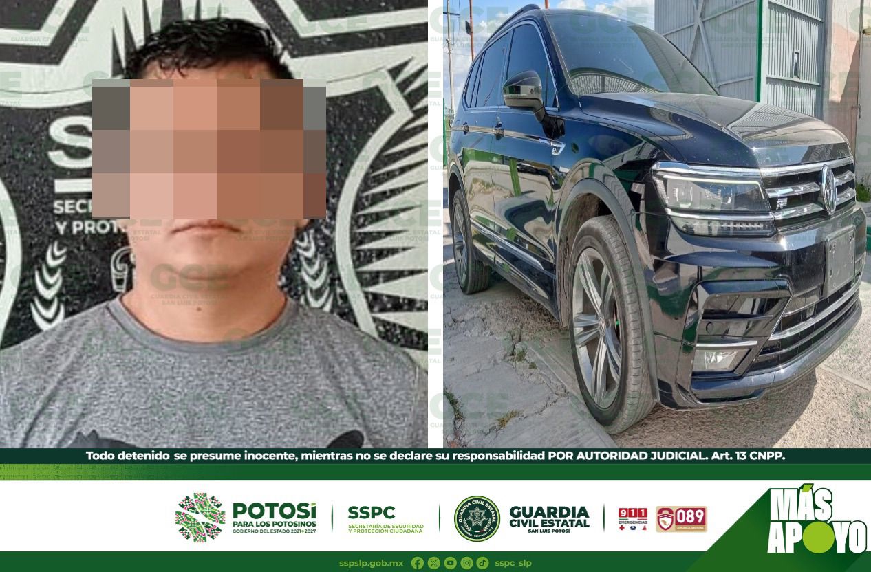 Matehuala, S.L.P.- Derivado de los trabajos efectuados por agentes de la Guardia Civil Estatal (GCE), un presunto miembro de la delincuencia fue detenido, a bordo de un vehículo con reporte de robo.