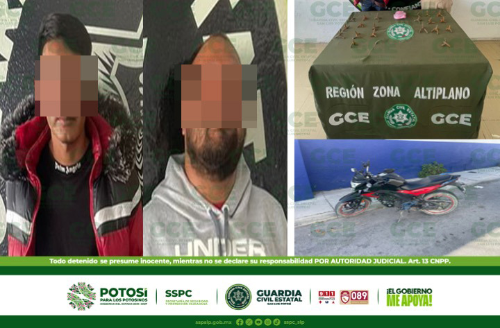Matehuala, S.L.P.- Derivado del despliegue operativo Altiplano Seguro, oficiales de la Guardia Civil Estatal (GCE) capturaron a dos presuntos “halcones” o informantes de la delincuencia, despojándoles de 20 artefactos de varilla conocidos como “poncha llantas”.