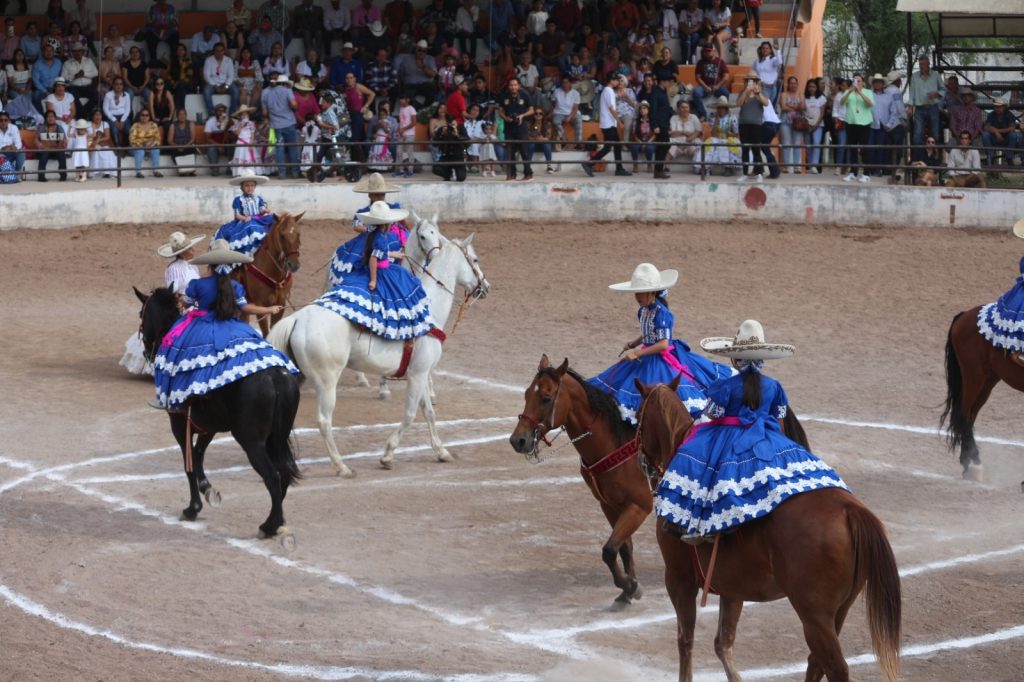 Además de la coronación, la escaramuza realizó su primera exhibición con vistosos ejercicios, siendo aplaudida por las y los asistentes; adicionalmente se presentaron rutinas por los demás equipos de la misma Asociación Puente de la Cruz, los equipos de Caballito de Palo, de la Categoría Infantil B y los conjuntos Rojo y Azul de la categoría Libre.