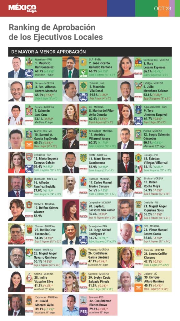 • México Elige, en su estudio de octubre de 2023, ubicó al Gobernador del Estado en segundo lugar con mayor aprobación ciudadana, al lograr 66.2 por ciento, solo por debajo de Querétaro