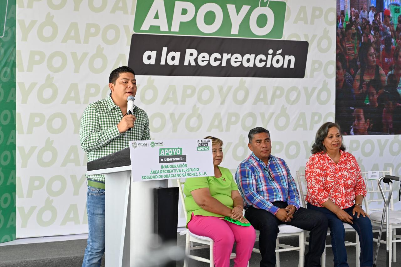 Más de 10 mil habitantes de diferentes colonias de Soledad de Graciano Sánchez ahora tendrán un área para la sana convivencia, gracias al apoyo que les brinda el Gobernador de San Luis Potosí Ricardo Gallardo Cardona, con la construcción de espacios recreativos e incluyentes para toda la familia, como la nueva Unidad Recreativa “El Refugio” que entregó este jueves en el fraccionamiento el refugio.