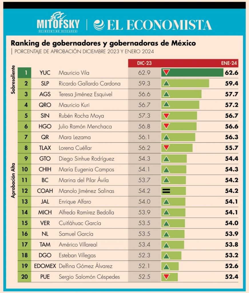 El Ranking Mitofsky destaca que San Luis Potosí se ubica en el segundo lugar, solo después de Yucatán y por encima de estados como Aguascalientes, Querétaro, Sinaloa, Hidalgo, Quintana Roo, Tlaxcala, Guanajuato y Chihuahua y resalta que Ricardo Gallardo se posicionó como el primer lugar a nivel nacional entre los gobernadores afines a Morena.
