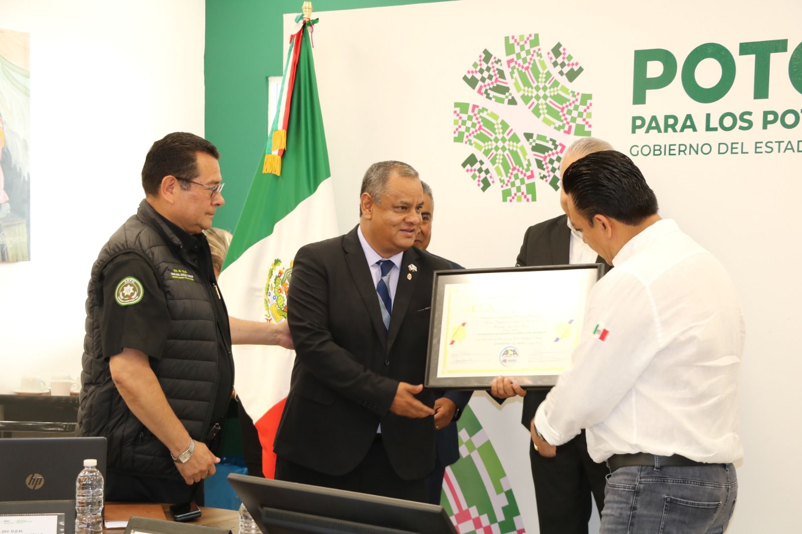 En el marco de la Mesa de Coordinación para la Construcción de la Paz Social, el Secretario de Seguridad, Guzmar Ángel González Castillo acompañado de autoridades penitenciarias, realizaron la entrega al Secretario General de Gobierno, José Guadalupe Torres Sánchez del reconocimiento oficial emitido por la Asociación de Correcionales de América (ACA) debido a la recertificación del Centro Penitenciario de Rioverde.