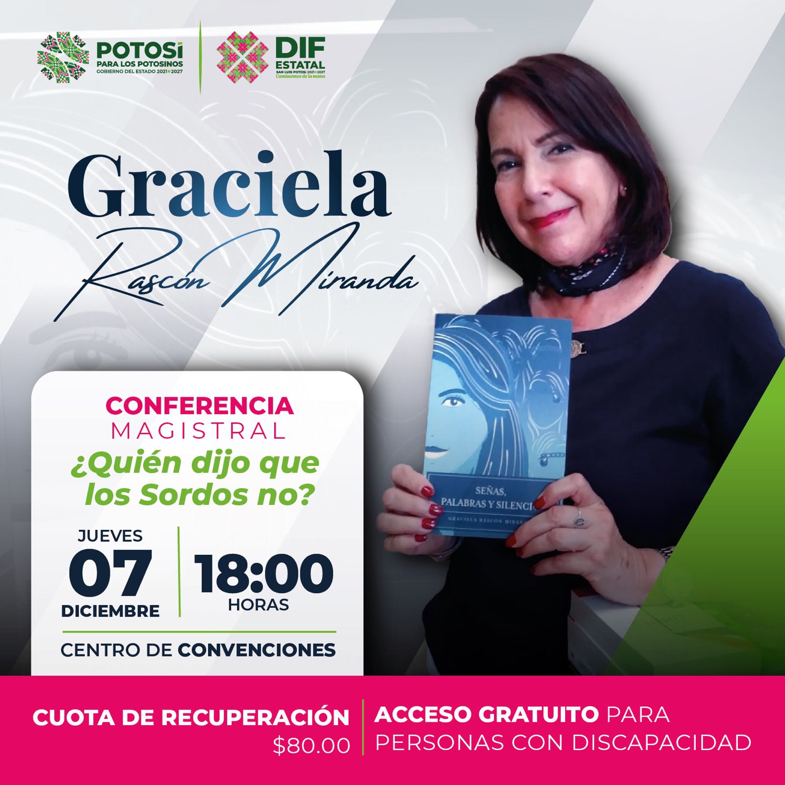 En el marco del Día Internacional de la Discapacidad, que se conmemora cada 3 de diciembre, y en apoyo de la inclusión, el Sistema Estatal para el Desarrollo Integral de la Familia (DIF), realizará el jueves 07 de diciembre en el Centro de Convenciones, la conferencia «¿Quién dijo que los sordos no?», impartida por Graciela Tomasa Rascón Miranda, la primera persona sorda en México que escribe por sí misma y publica un libro autobiográfico.