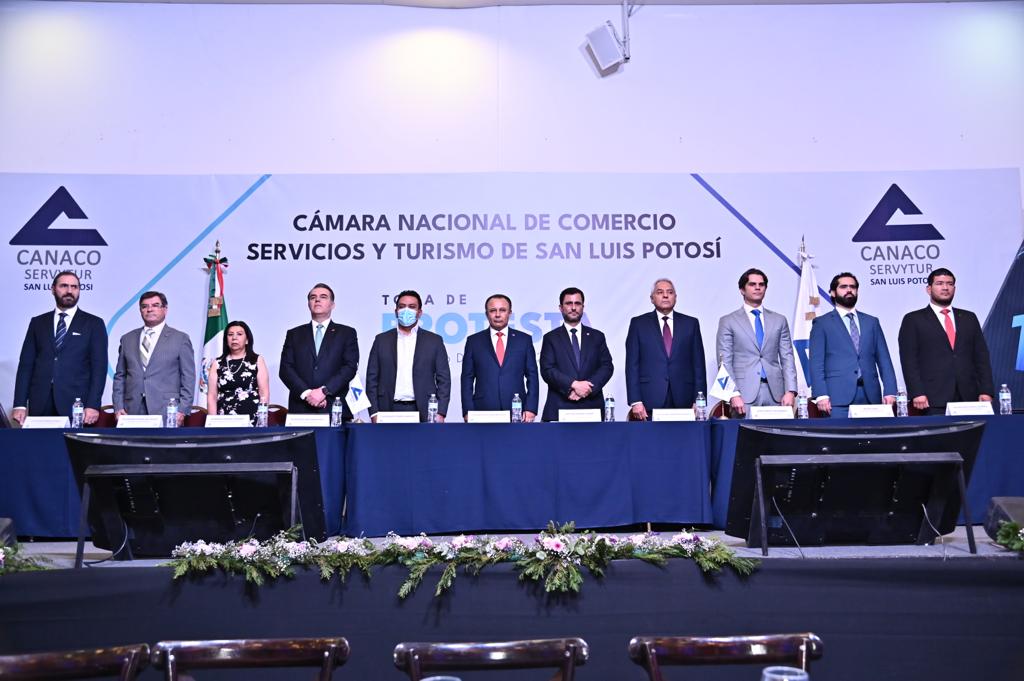 En representación del Gobernador de San Luis Potosí, Ricardo Gallardo Cardona, el titular de la Secretaría General de Gobierno (SGG), J. Guadalupe Torres Sánchez, acudió como testigo de honor a la toma de protesta del presidente y Consejo Directivo de la Cámara Nacional de Comercio, Servicios y Turismo (Canaco-Servytur) para el periodo 2023-2024, que preside Fernando Díaz de León Hernández.