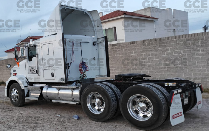 El primer aseguramiento tuvo lugar en el fraccionamiento Los Lagos, en donde oficiales de la GCE ubicaron un tractocamión marca Kenworth, modelo 2018, color blanco. La unidad contaba con reporte de robo de la comunidad de Santo domingo, en el municipio de Santa María del Río.