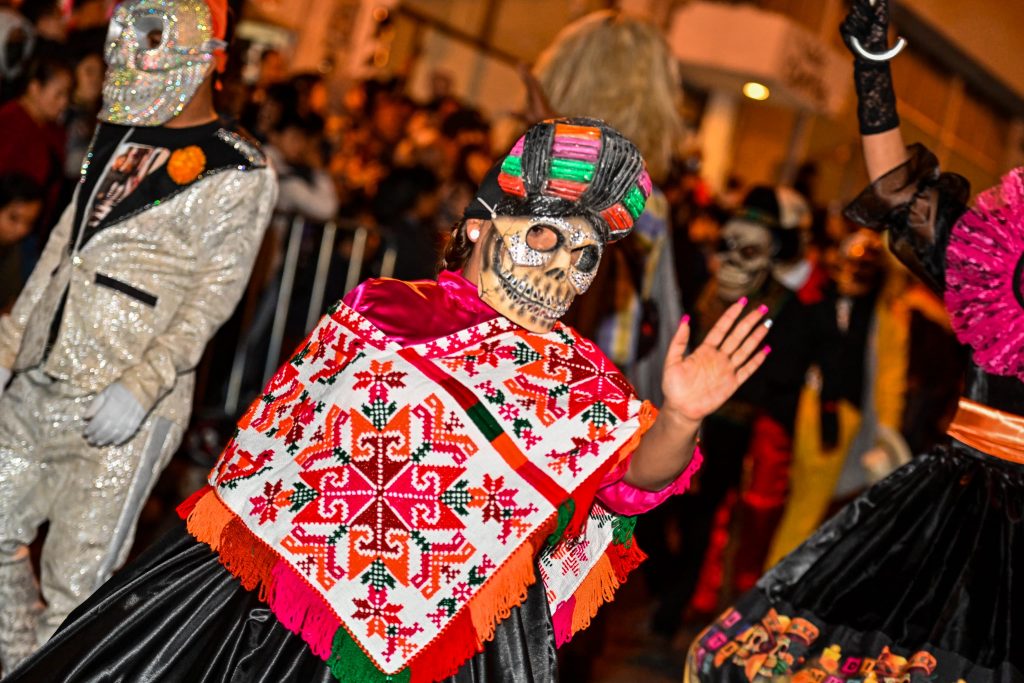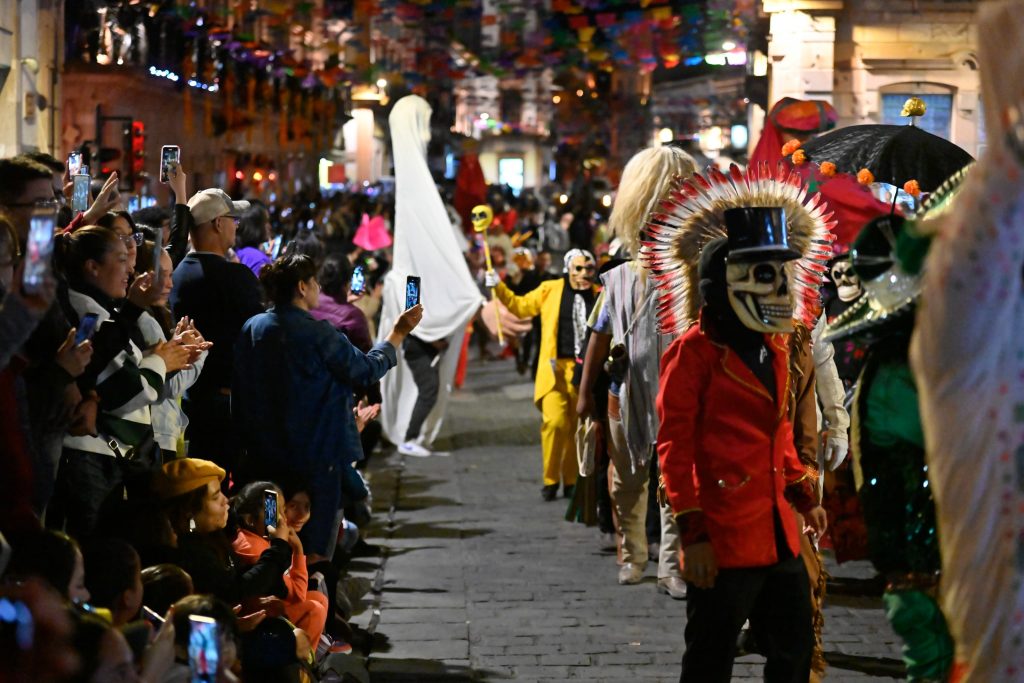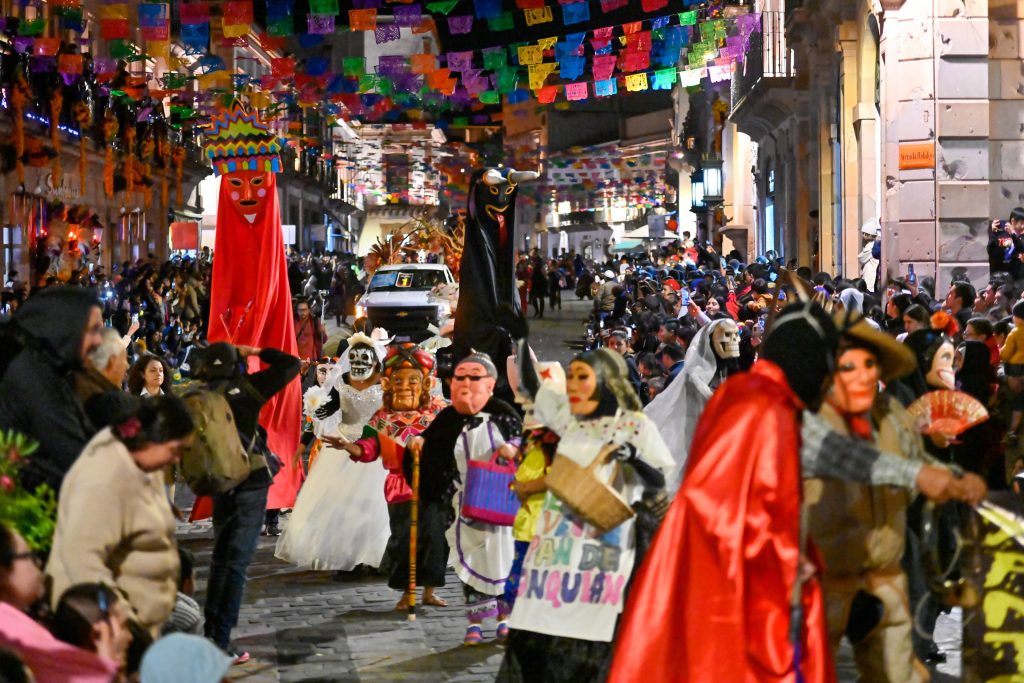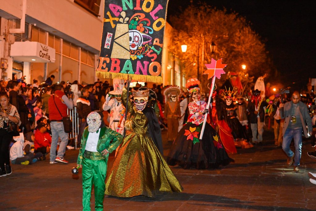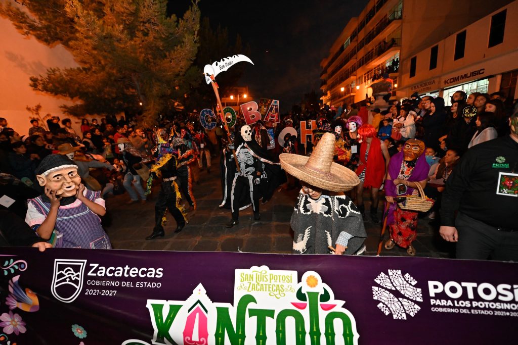 Zacatecas, Zacatecas.- El Gobierno de Estado de San Luis Potosí a través de la Secretaría de Cultura, proyectó la riqueza cultural y tradiciones ancestrales de la festividad huasteca del Xantolo, en el magno desfile del Día de Muertos en Zacatecas ante miles de visitantes nacionales y extranjeros que se dieron cita para admirar los tríos, comparsas, mojigangas, altares tradicionales y máscaras monumentales llevadas al estado vecino.