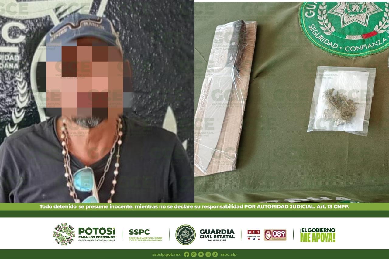 Matehuala, S.L.P.- Efectivos de la Guardia Civil Estatal (GCE) detuvieron a un hombre en el municpio de Matehuala por el probable delito de portación de un arma blanca y una bolsa de marihuana.